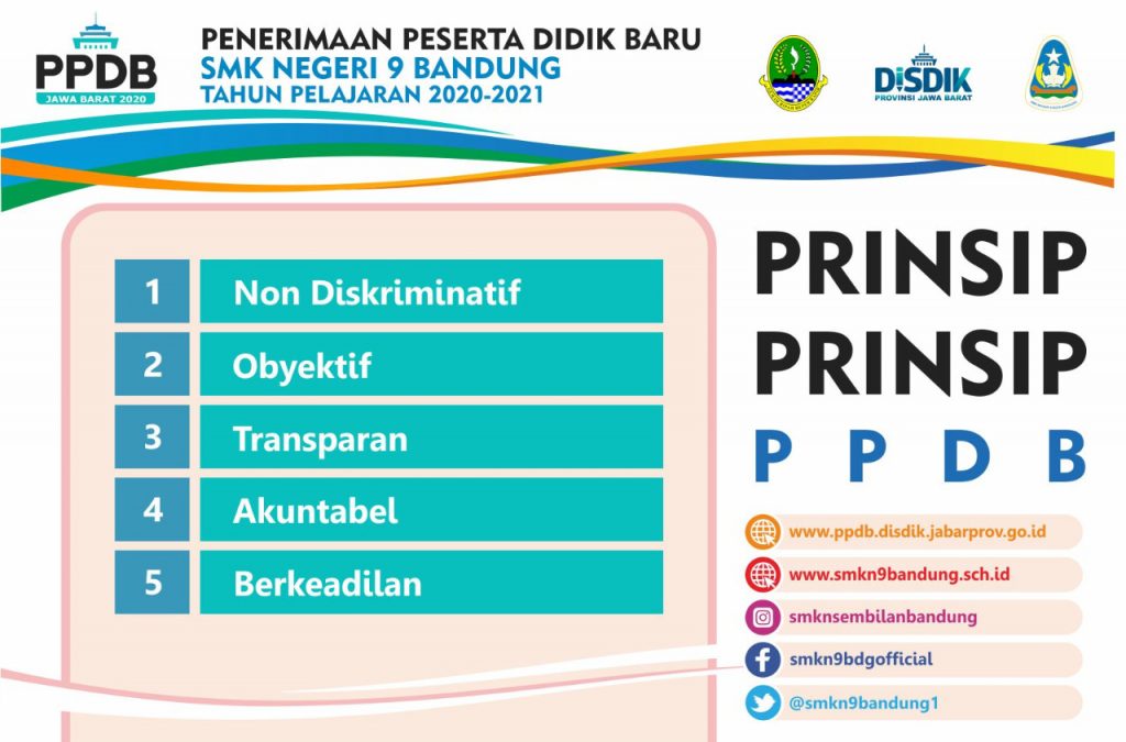 Dalam PPDB tahun ini juga diterapkan beberapa prinsip diantaranya non diskriminatif, objektif, transparan, akuntabel, dan berkeadilan. Sementara kuota pendaftaran untuk PPDB tahun ini di SMKN 9 Bandung dibagi menjadi beberapa jalur, yaitu :