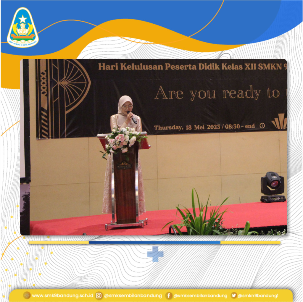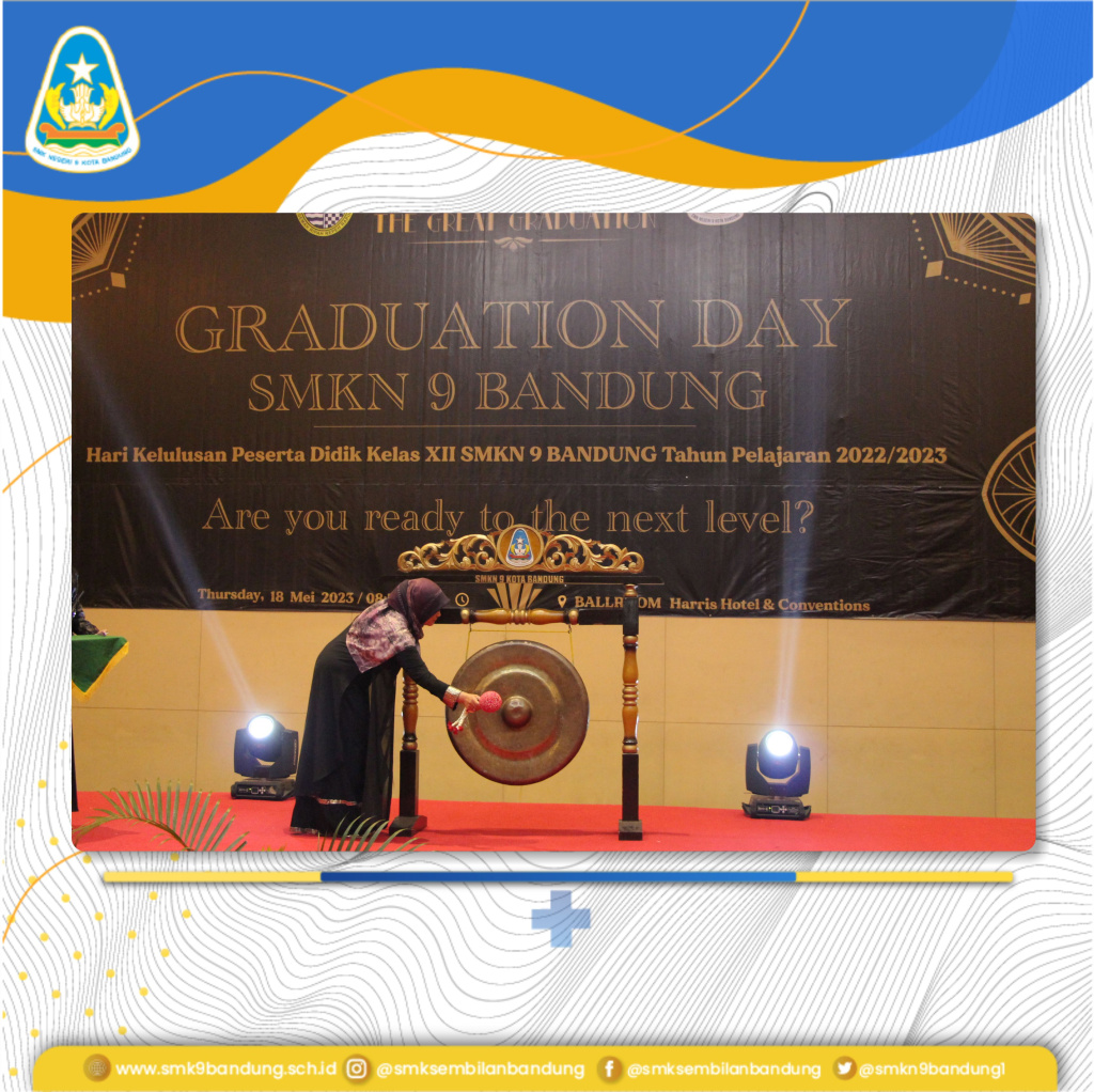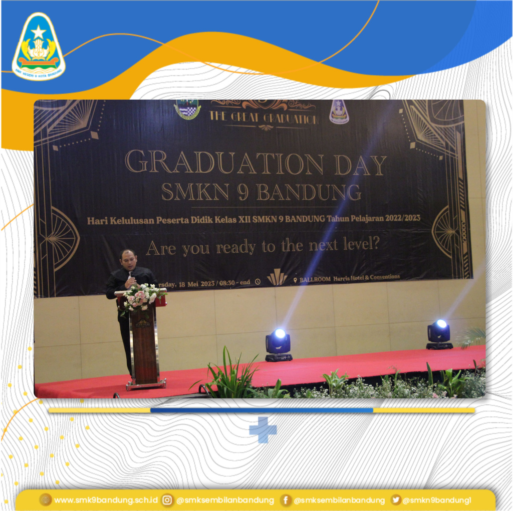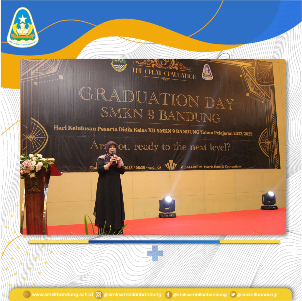 Kepala SMKN 9 Bandung, Yani Heryani M.M.Pd. melepas peserta didik kelas XII tahun pelajaran 2022/203 pada acara Graduation Day yang dilaksanakan di Harris Hotel & Conventions Festival Citylink Bandung pada hari Kamis, 18 Mei 2023. Acara dihadiri juga oleh tim manajemen sekolah, wali kelas, para pendidik dan tenaga kependidikan, komite sekolah, serta tamu undangan lainnya.
