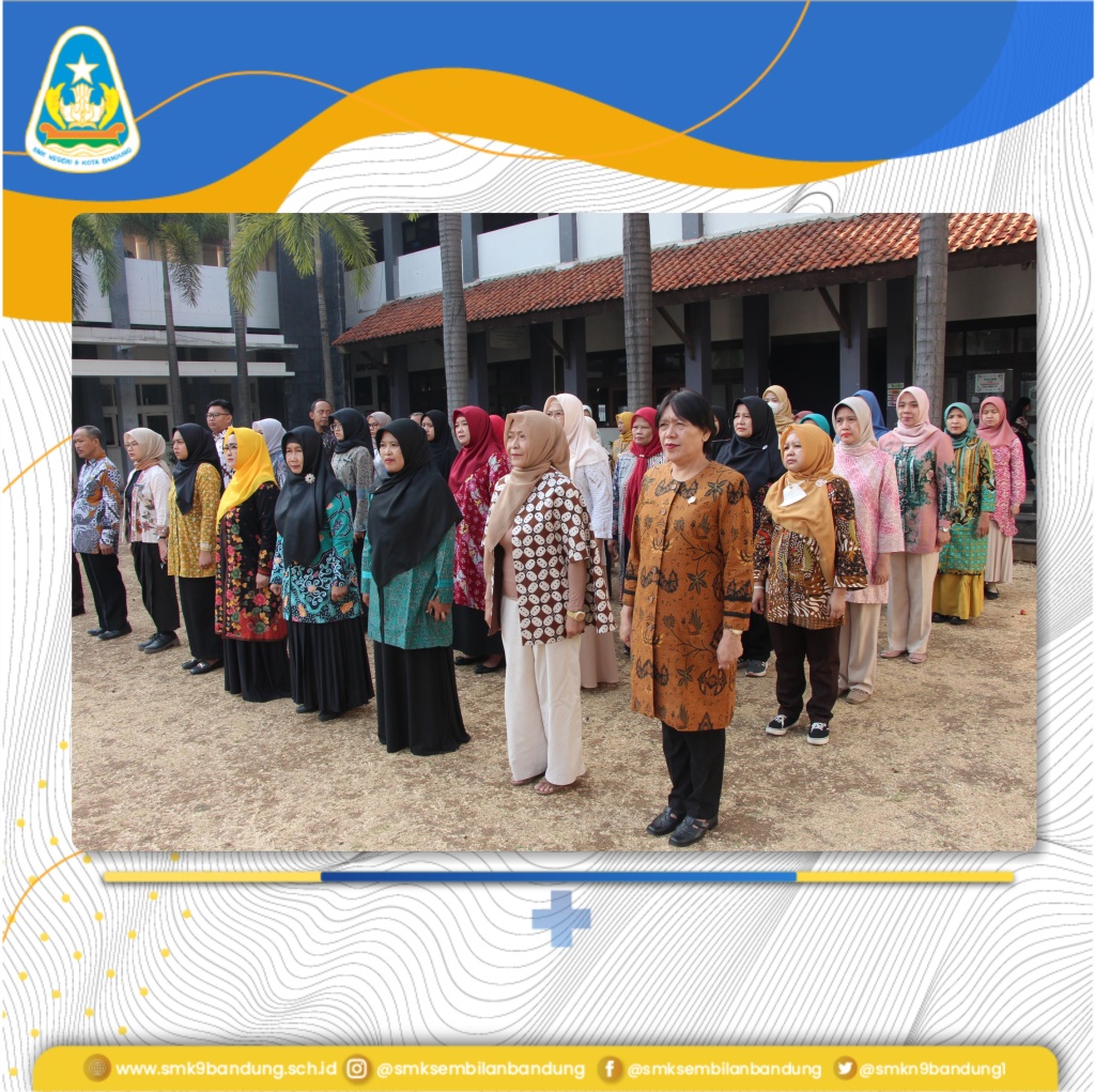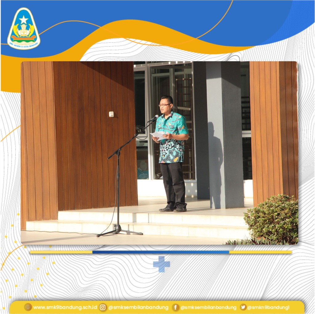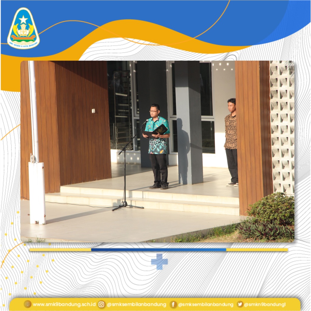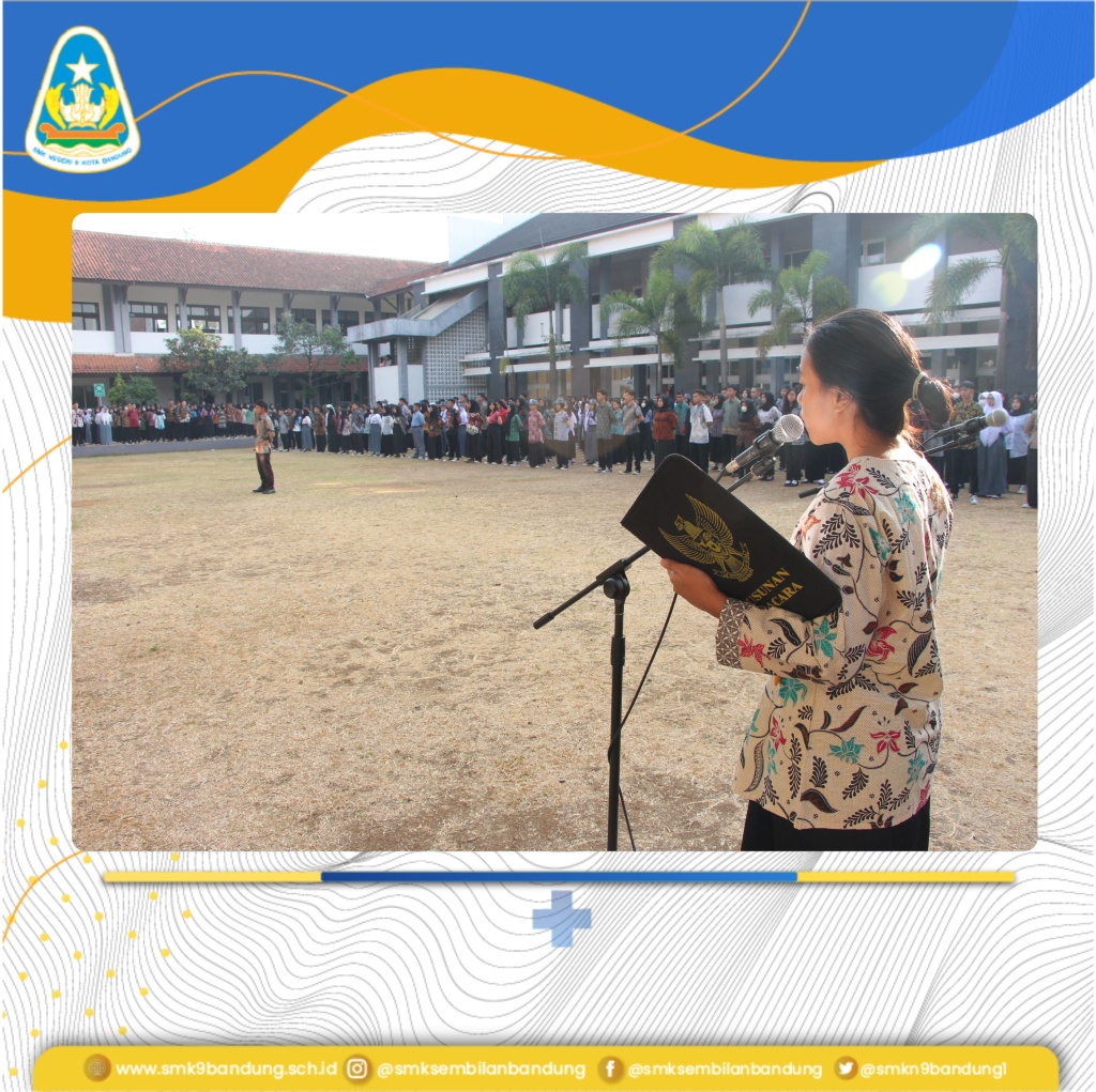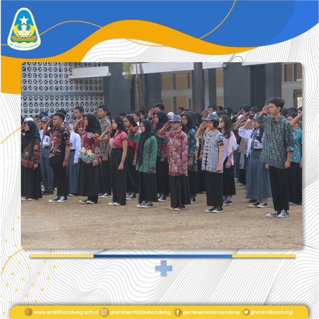 Peserta didik SMKN 9 Bandung mengikuti upacara penaikan bendera yang rutin dilaksanakan setiap hari Senin. Upacara hari ini tanggal 2 Oktober 2023 diikuti juga oleh para pendidik dan tenaga kependidikan, dengan pembina upacara Ae Saepuloh, S.S.T.Par. (Kaprog. Perhotelan & Pariwisata).