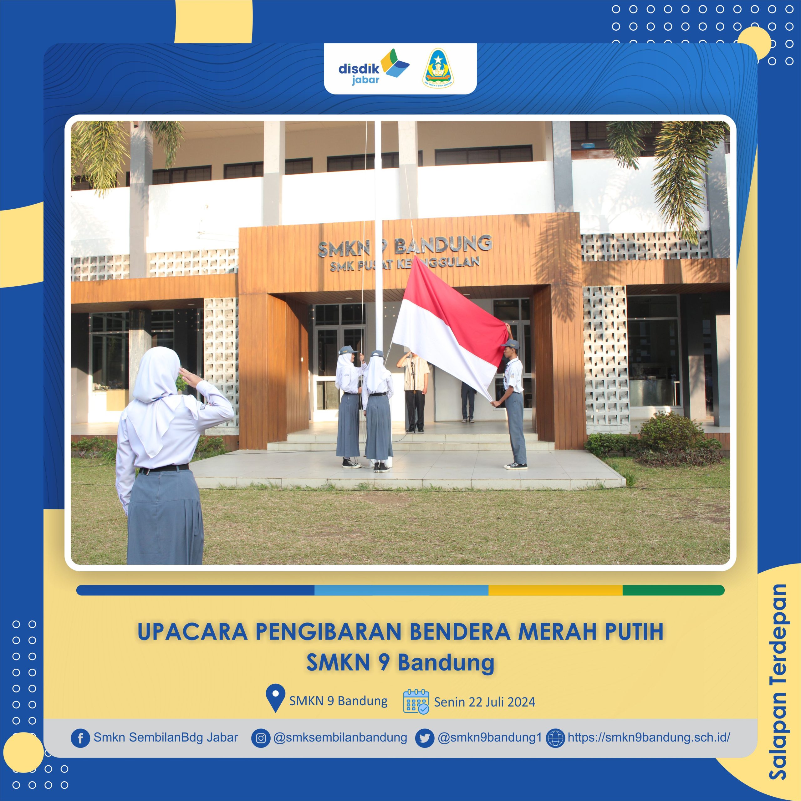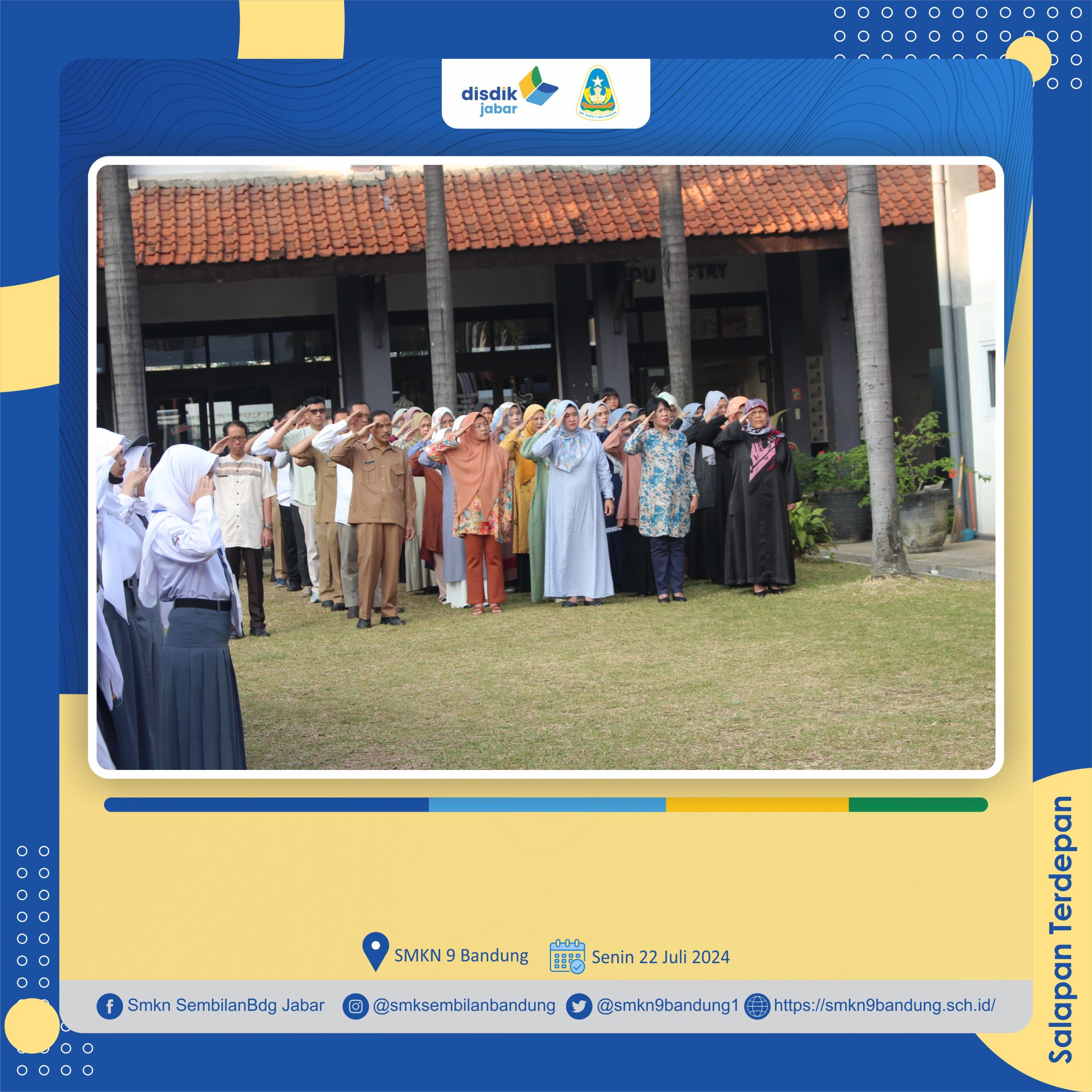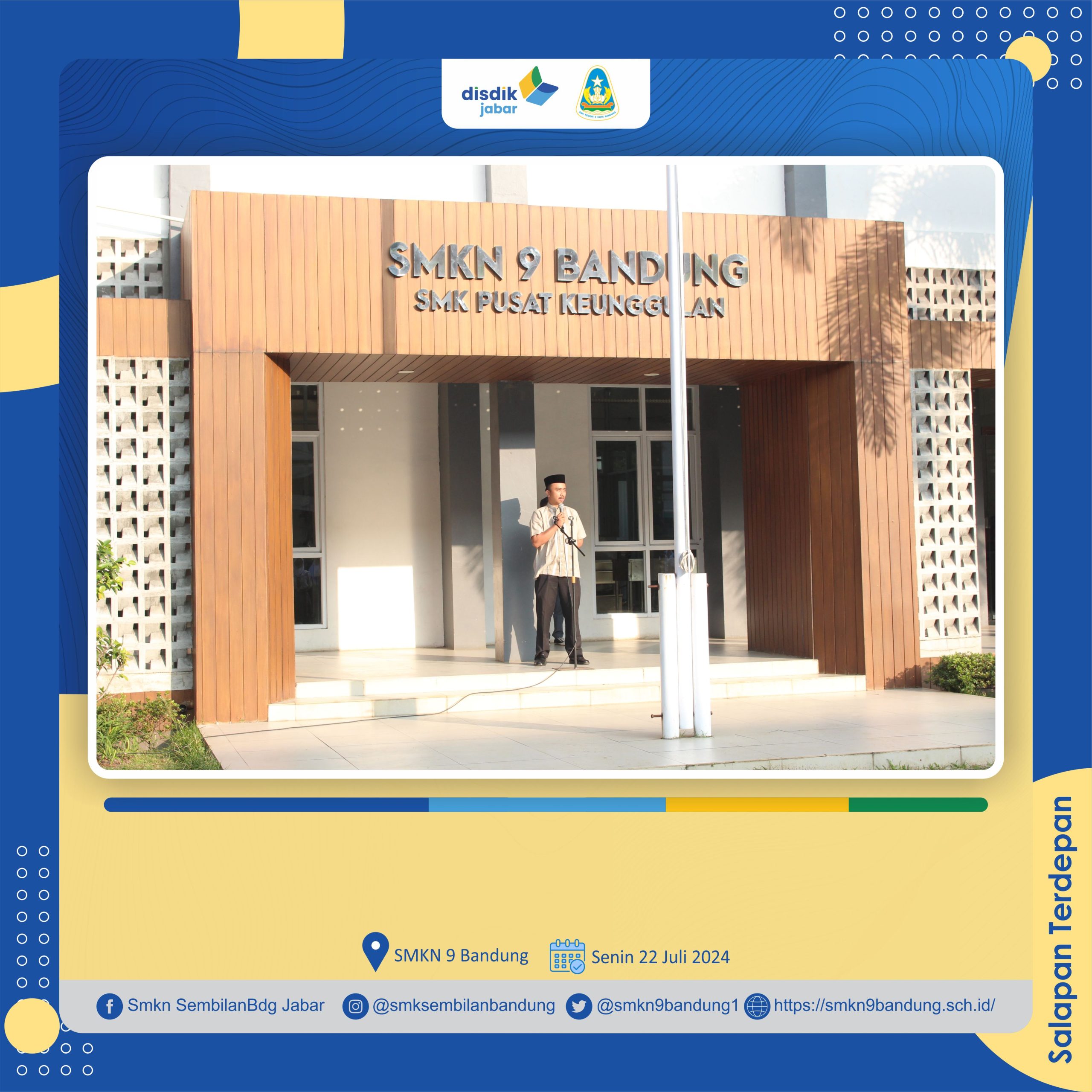 Peserta didik SMKN 9 Bandung mengikuti upacara penaikan bendera hari Senin, 22 Juli 2024. Upacara juga diikuti oleh para pendidik dan tenaga kependidikan, dengan pembina upacara, Idfi Nurfajar, S.Pd. Melalui kegiatan upacara bendera, diharapkan dapat memberikan manfaat yang sangat baik dalam upaya penumbuhan budi pekerti dan karakter bangsa, terutama nilai-nilai kebangsaan, cinta tanah air dan kebhinekaan bagi para peserta didik.