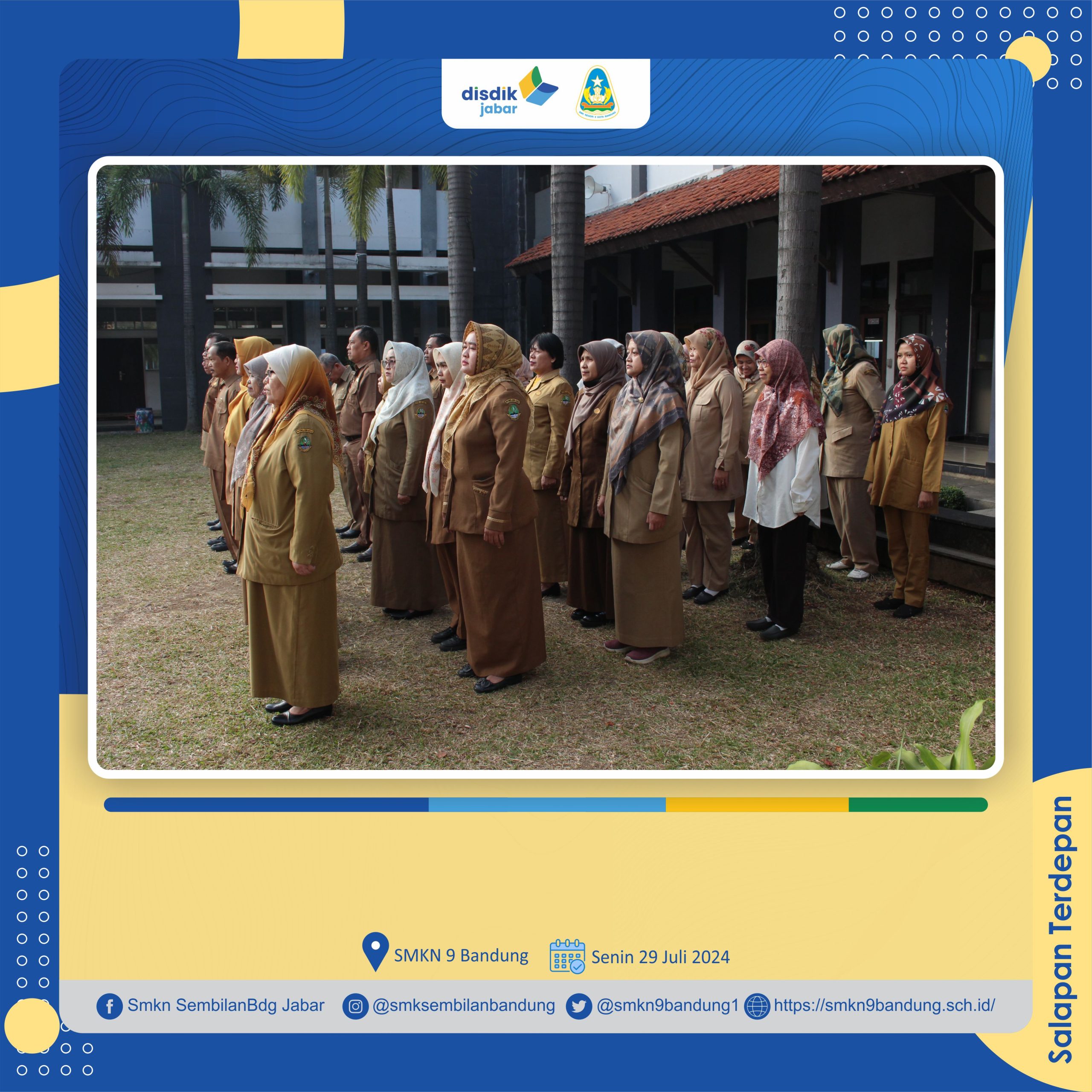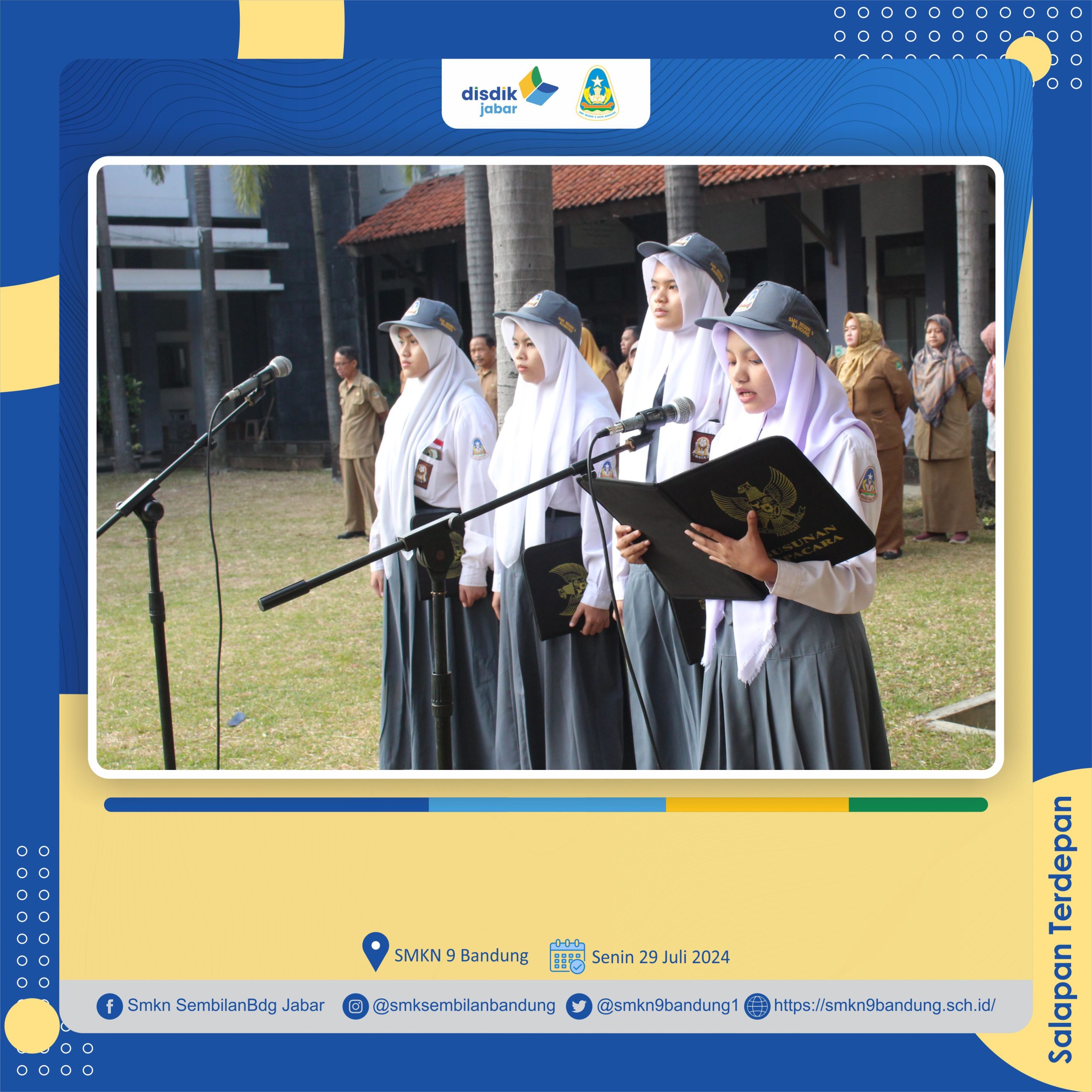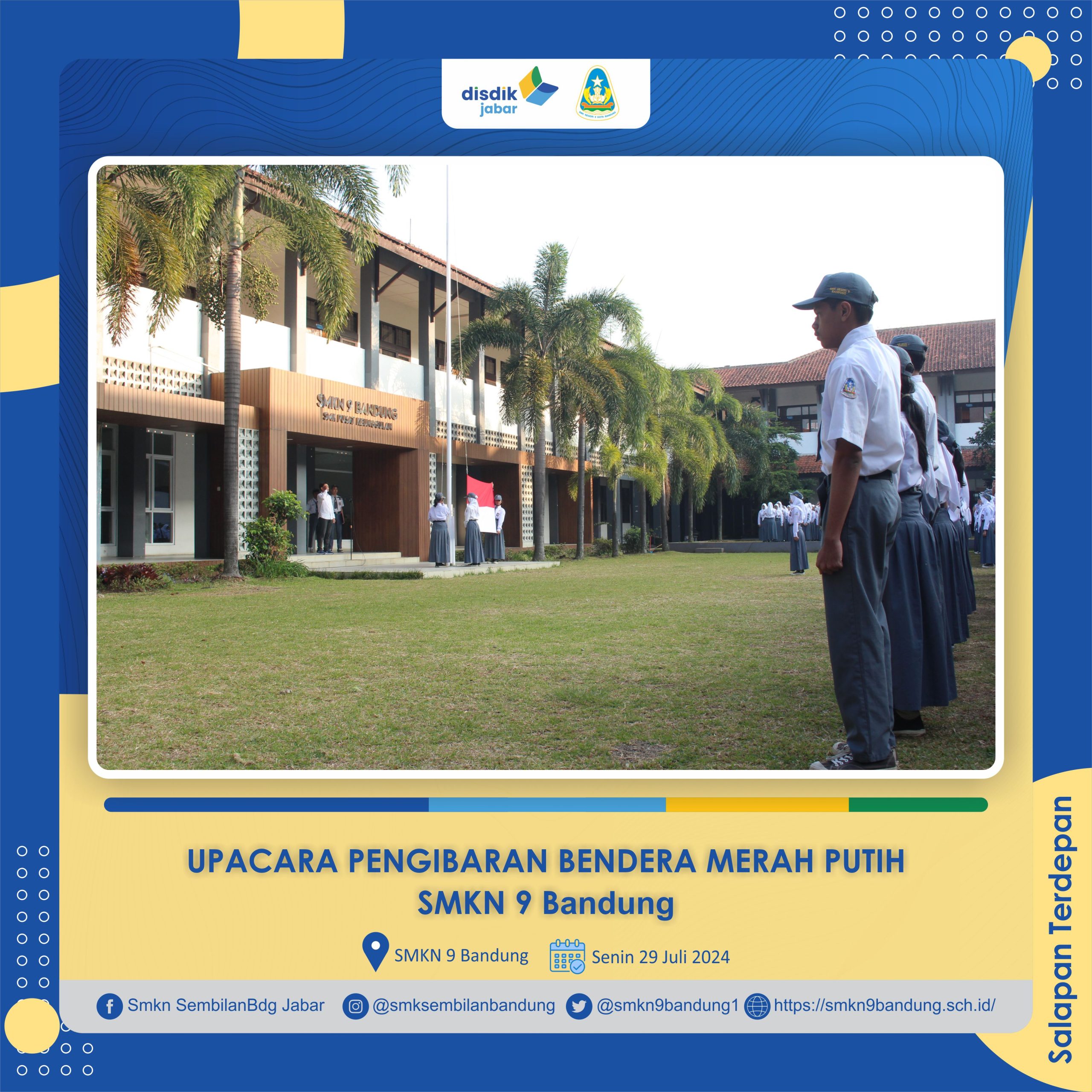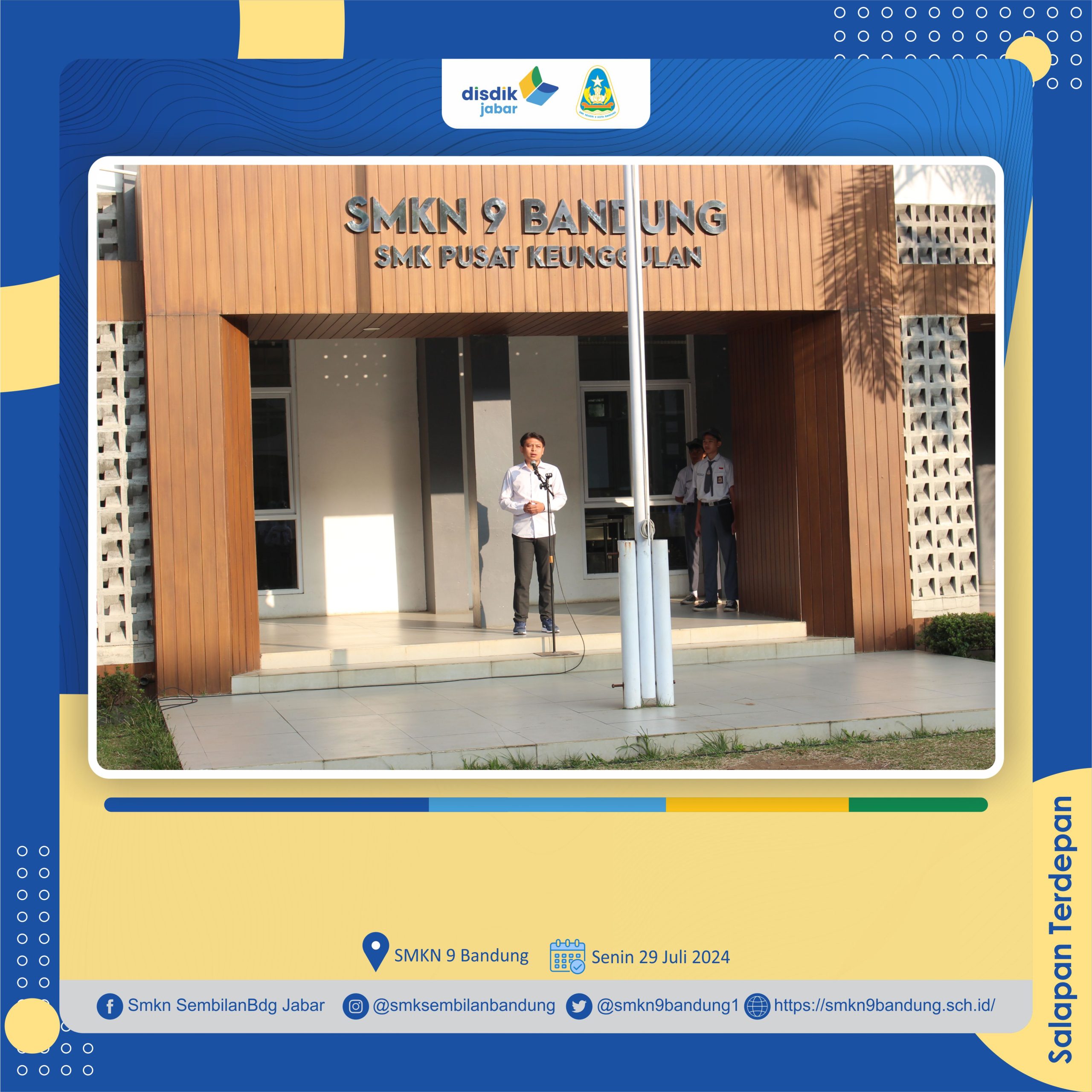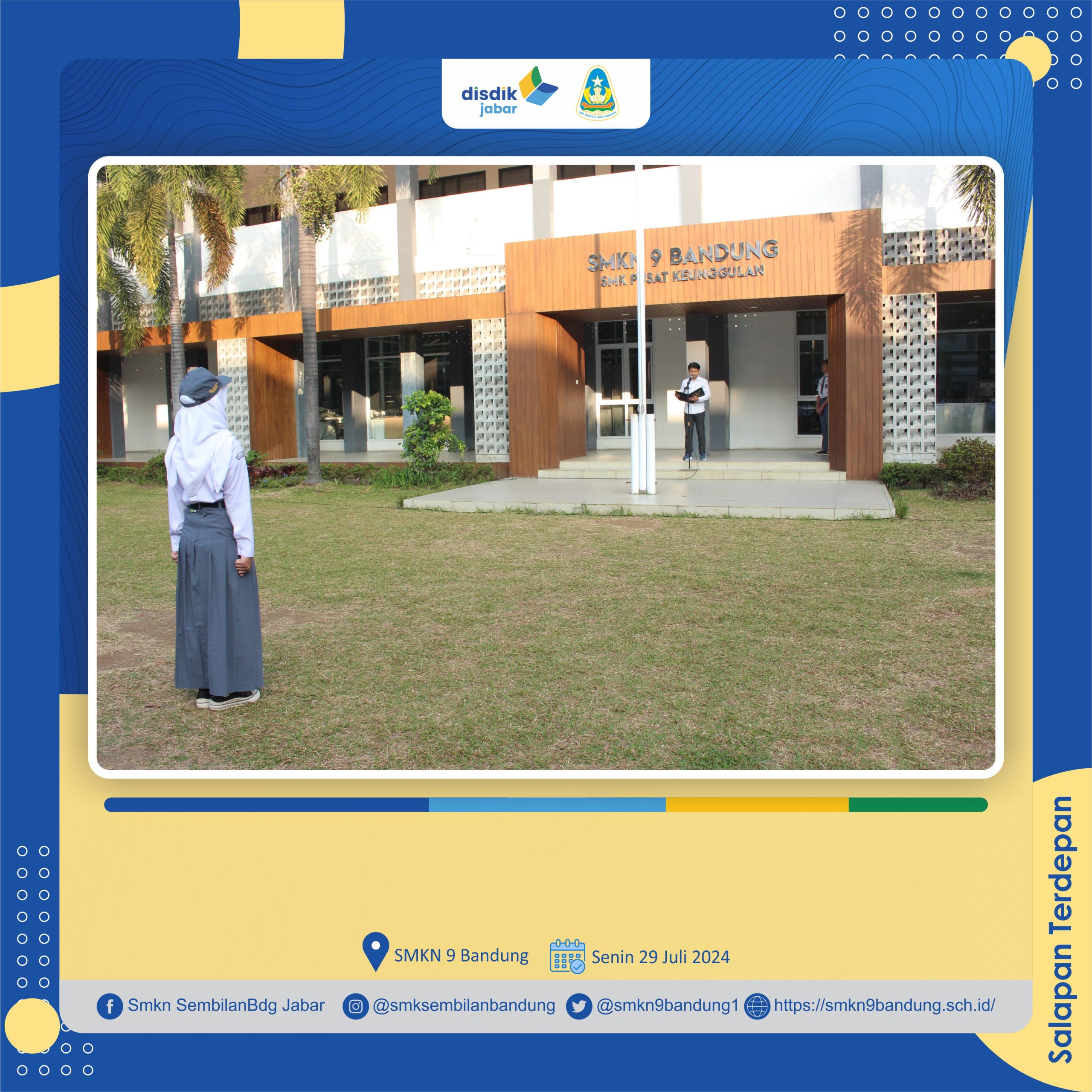 Warga SMKN 9 Bandung mengikuti upacara penaikan bendera yang rutin dilaksanakan setiap hari Senin. Upacara hari ini tanggal 29 Juli 2024 juga diikuti oleh para pendidik dan tenaga kependidikan, serta peserta didik dengan pembina upacara, Ahmad Dayu Purnama, S.Sos. Peserta didik diharapkan dapat mendapat berbagai manfaat positif setelah mengikuti upacara bendera, hal tersebut dalam rangka menumbuhkan budi pekerti dan karakter bangsa, terutama nilai-nilai kebangsaan, cinta tanah air dan kebhinekaan.