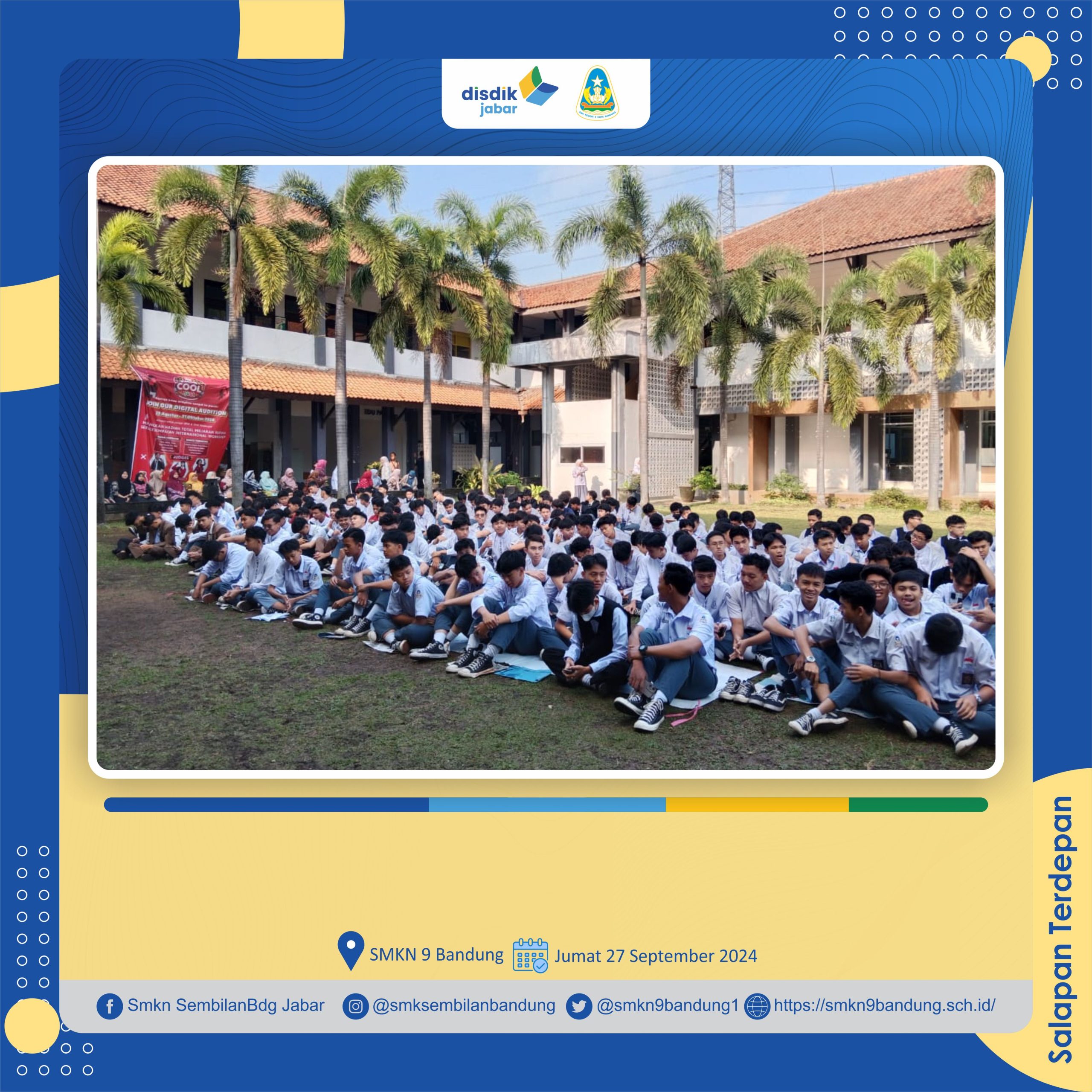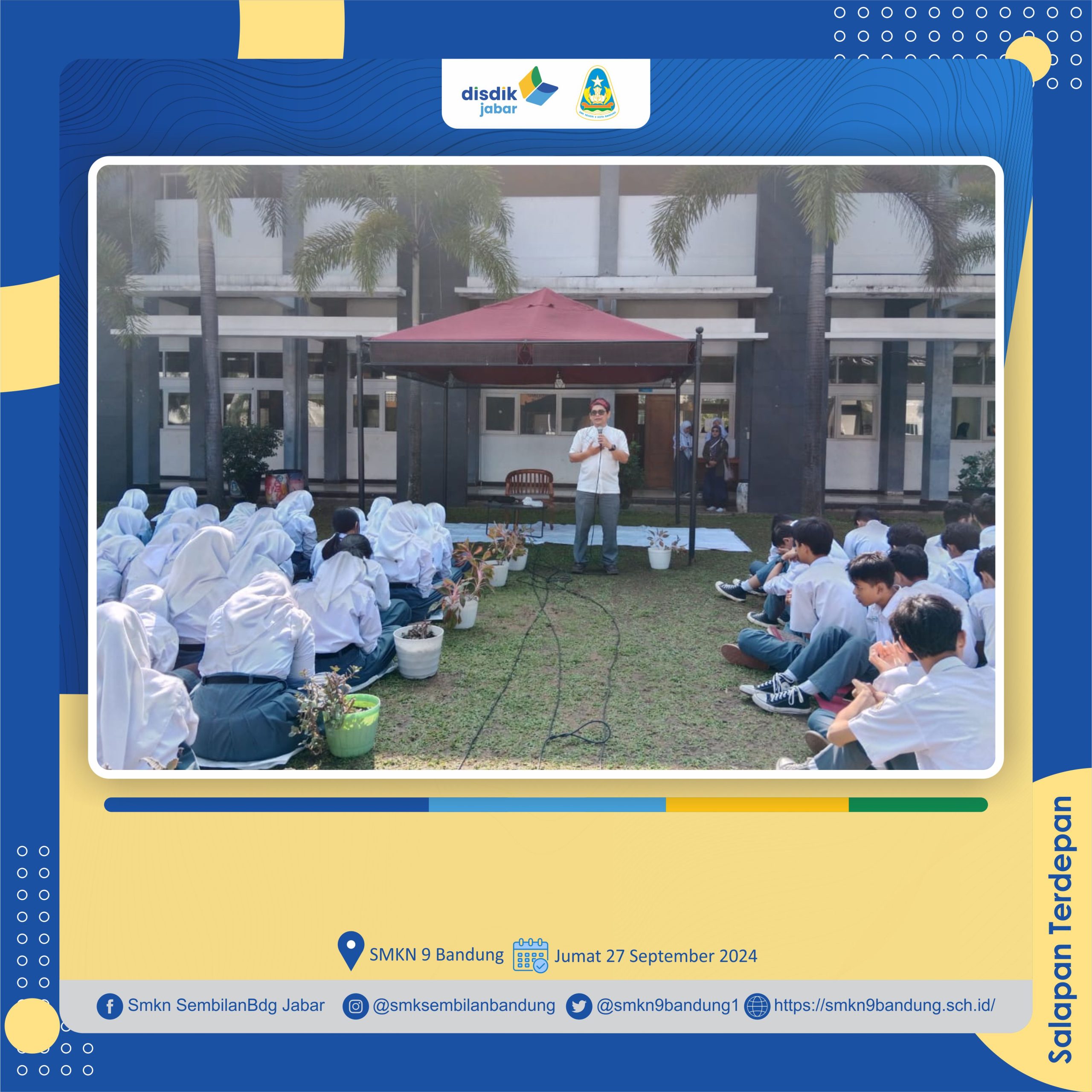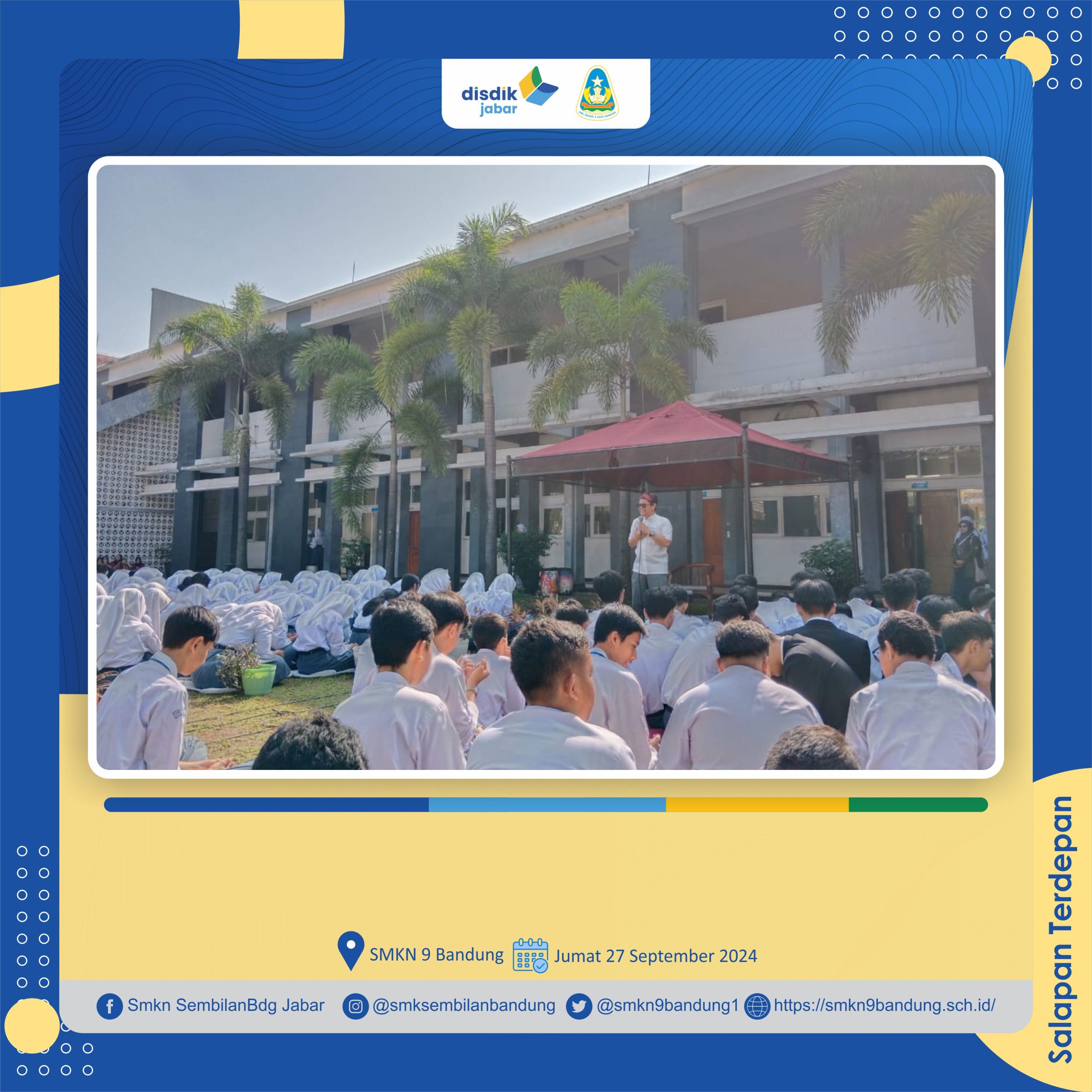 Peserta didik SMKN 9 Bandung mengikuti kegiatan Salapan Mengaji atau yang lebih akrab dengan nama Panji, acara dilaksanakan pada hari Jumat, 27 September 2024 di lapang upacara SMKN 9 Bandung. Pada Panji kali ini diikuti oleh seluruh peserta didik yang berkumpul di lapang upacara. Mereka dengan antusias menyimak materi yang disampaikan oleh Ustadz Hendri Juhana. Melalui kegiatan ini, diharapkan dapat memberikan penguatan kembali spirit kerohanian seluruh warga SMKN 9 Bandung.