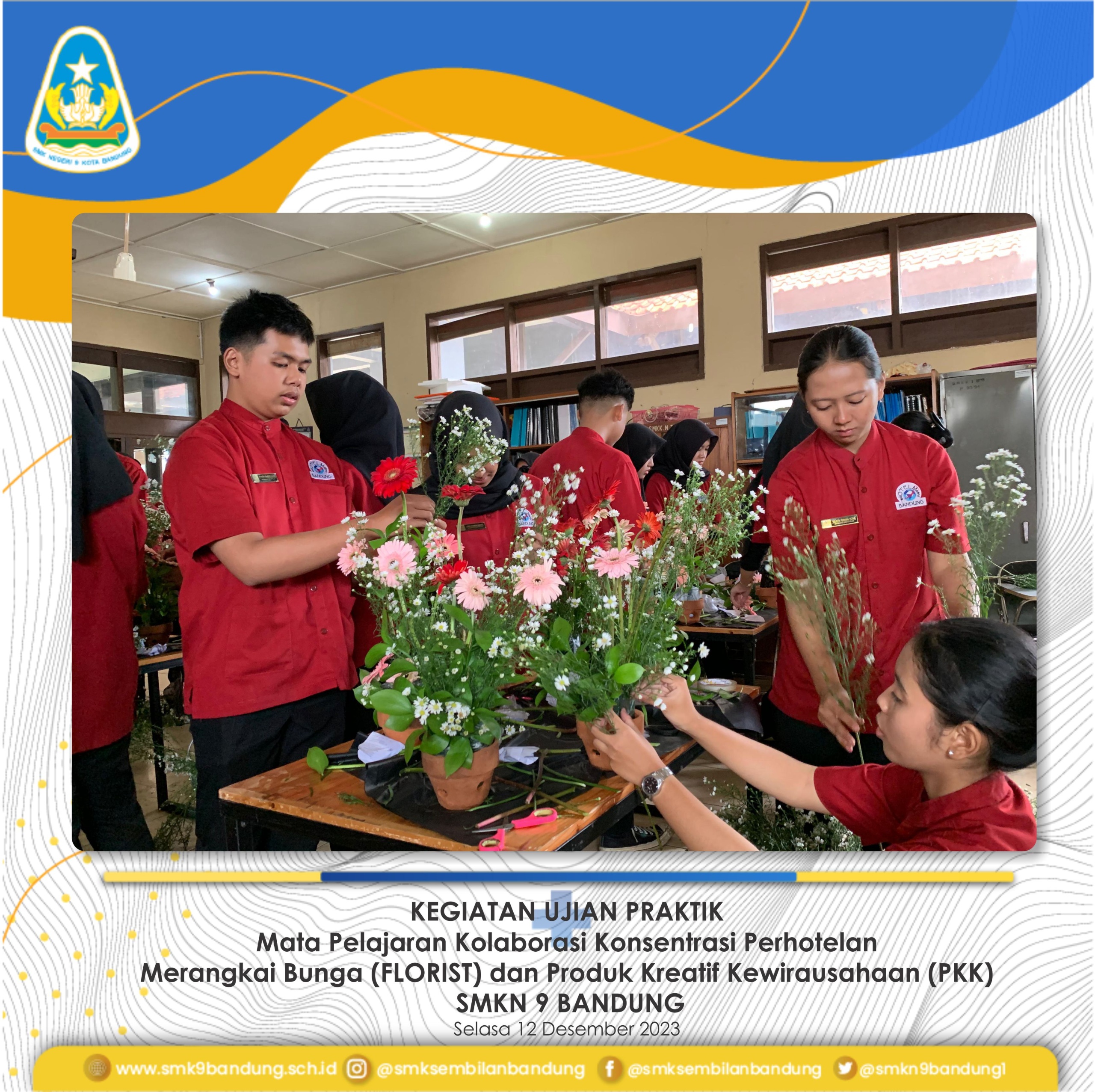 Kegiatan Ujian Praktik dalam rangka PENILAIAN AKHIR SEMESTER (PAS) Mata pelajaran Kolaborasi Konsentrasi Perhotelan Merangkai Bunga (FLORIST) dan Produk Kreatif Kewirausahaan (PKK) kelas XI perhotelan dilaksanakan pada tanggal 12 desember 2023.