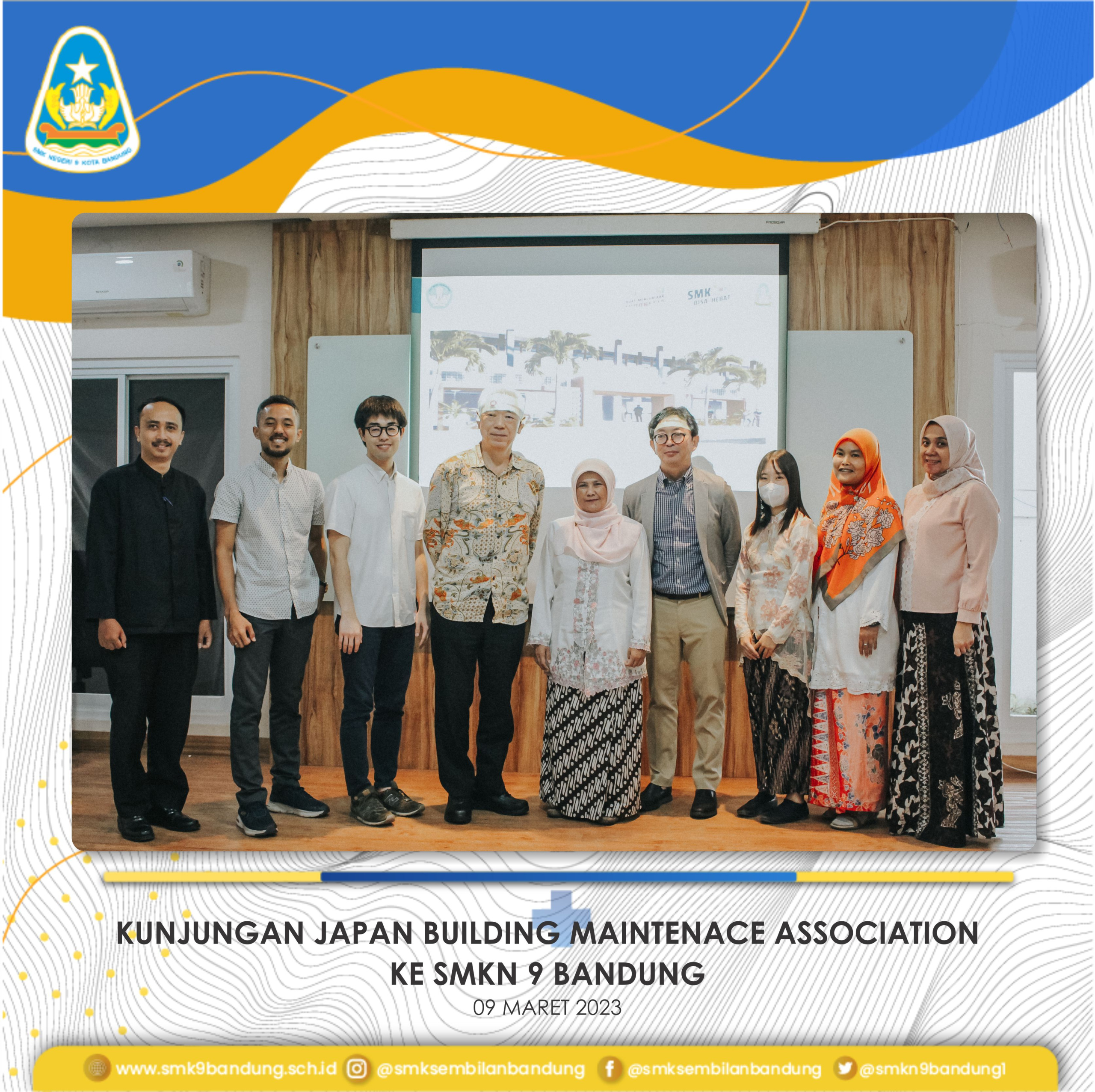 Kepala SMKN 9 Bandung Yani Heryani, M.M.Pd., menerima kunjungan dari tim Japan Building Maintenance Association (JBMA) pada hari Kamis, 9 Maret 2023 di meeting room Edotel. Dalam kunjungan tersebut merupakan perkenalan dan pembicaraan awal dari JBMA, selain itu JBMA juga menawarkan kerja sama berkaitan dengan penyaluran lulusan ke SMKN 9 Bandung untuk bekerja di Jepang, dan proses rekrutmen bisa langsung dilakukan di sekolah.