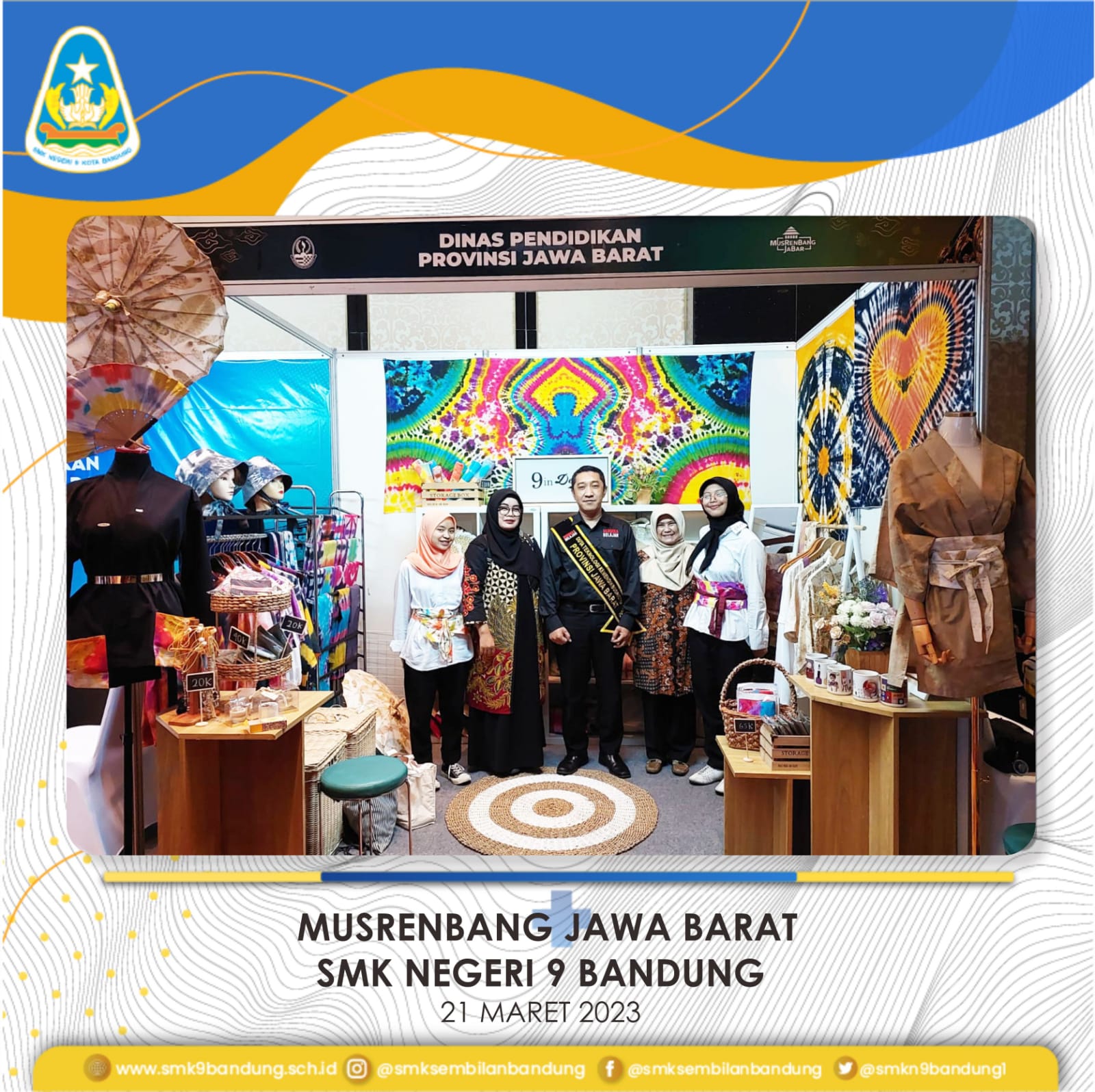 Teaching Factory Busana SMKN 9 Bandung berpartisipasi dalam acara pameran yang diselenggarakan Bappeda Provinsi Jawa Barat, dalam rangkaian kegiatan Musyawarah Perencanaan dan Pengembangan Pembangunan. Kegiatan dilaksanakan pada hari Selasa, 21 Maret 2023 di Ballroom Trans Luxury Hotel Bandung.