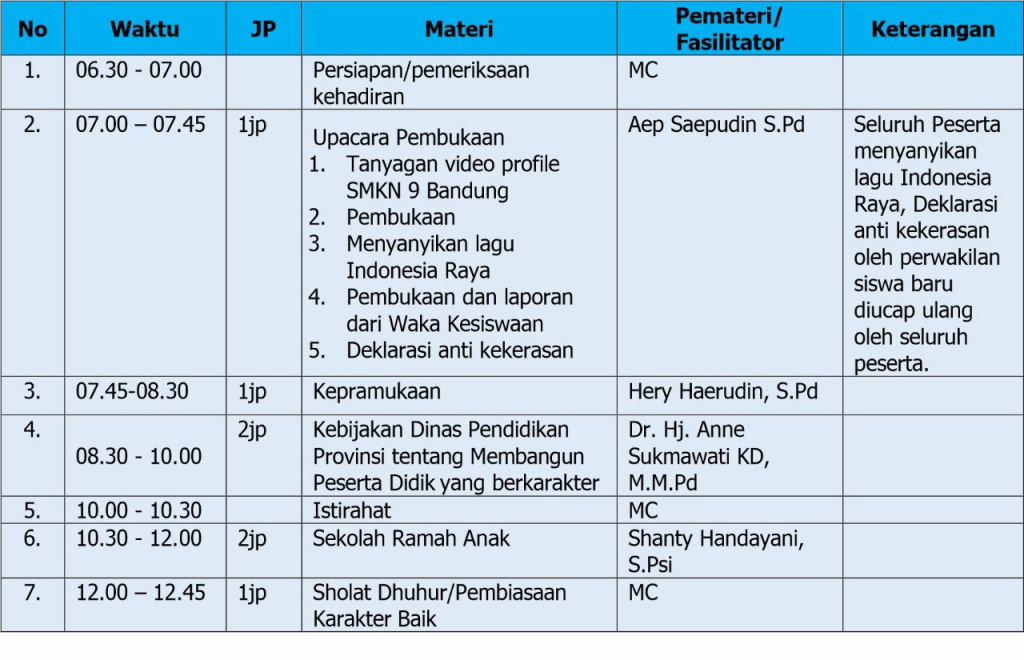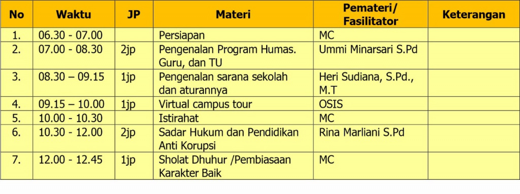 3. Pelaksana Kegiatan adalah Tanggung jawab kepala sekolah dengan melibatkan guru-guru serta Pengawas Pembina, Komite Sekolah beserta orangtua siswa. Untuk narasumber kegiatan sekolah berkoordinasi dengan pihak-pihak terkait.