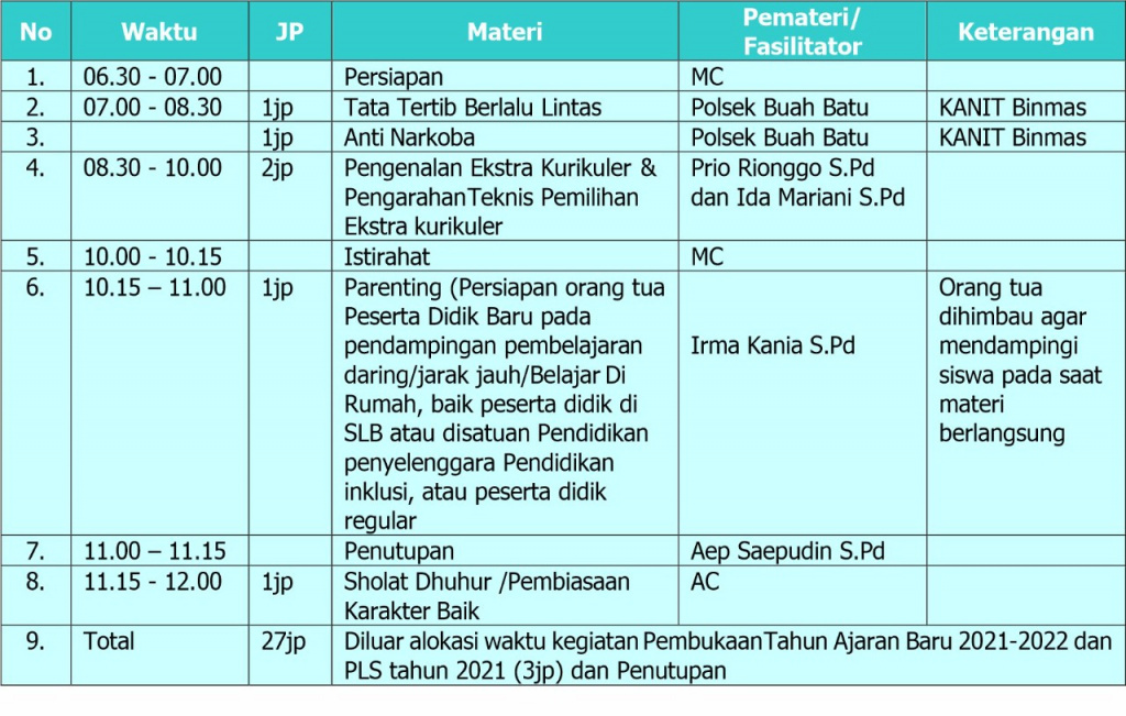 - Pembukaan Tahun Ajaran Baru 2021-2022 dan Pembukaan PLS Se-Jawa Barat tahun 2021, dilaksanakan pada hari Kamis, tanggal 15 Juli 2021.