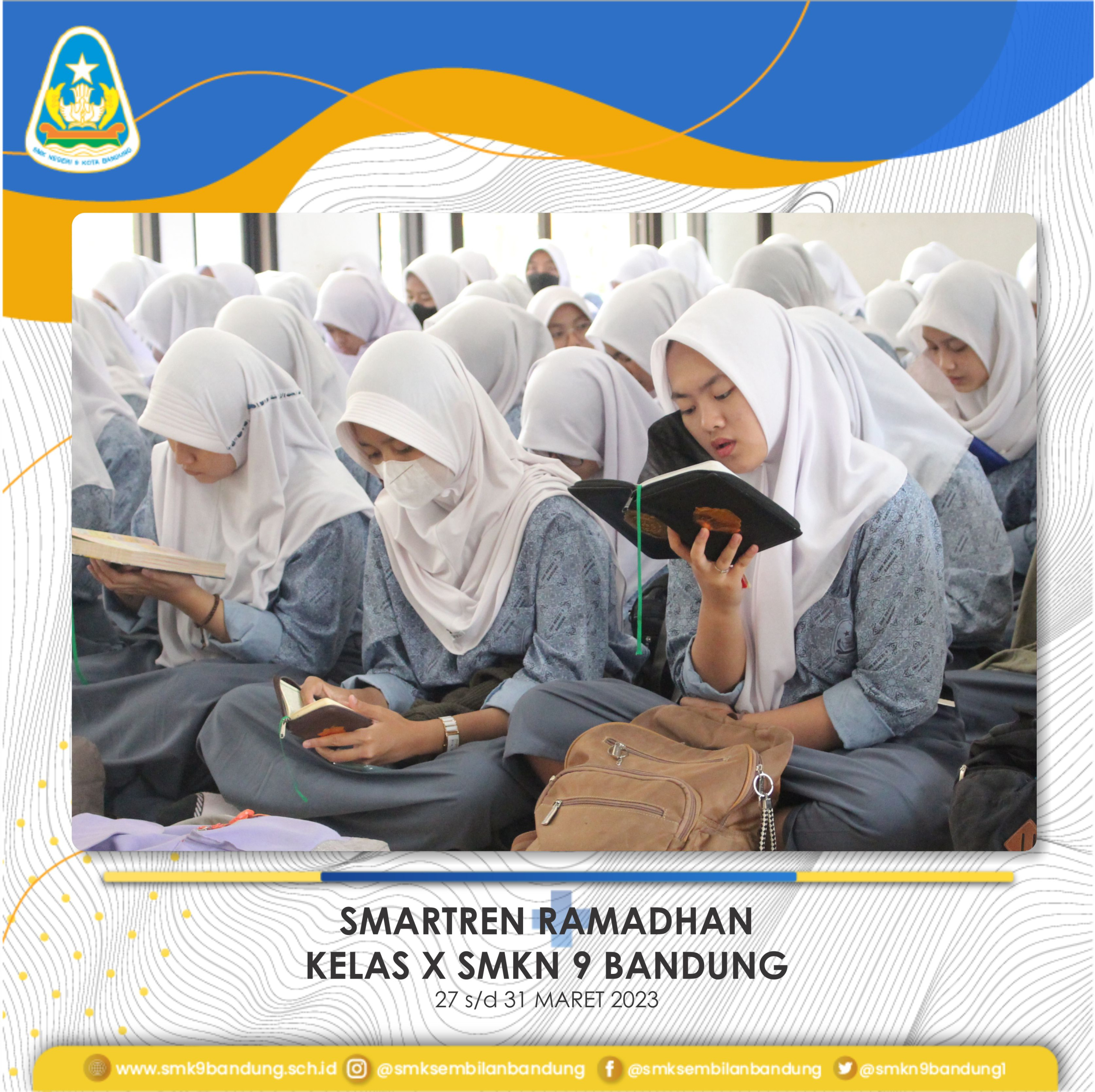 Peserta Didik Kelas X SMKN 9 Bandung mengikuti kegiatan SmartTren Ramadhan 2023 di sekolah yang dilaksanakan pada tanggal 27 s.d. 30 Maret 2023. Kegiatan yang berlangsung di Masjid Annisa Ussholihat dan aula ini diisi dengan berbagai jadwal diantaranya tadarus Al Quran bersama, kajian Islam di sekolah, shalat berjamaah, dan acara keagamaan lainnya.