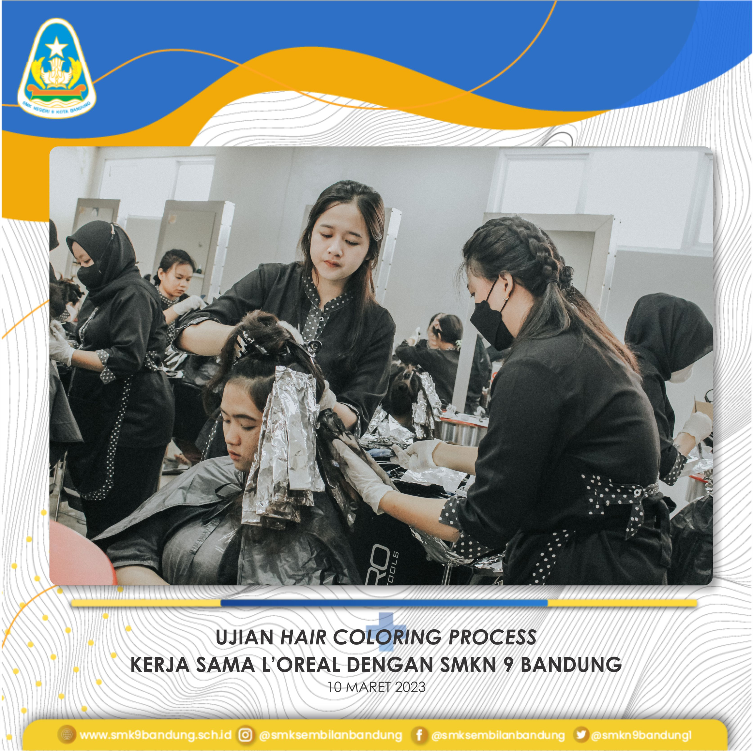 Peserta didik Kompetensi Keahlian Tata Kecantikan mengikuti ujian Hair Coloring Process pada hari Jumat, 10 Maret 2023 bertempat di ruang praktik Tata Kecantikan. Kegiatan ini merupakan bagian akhir atau dalam rangka menguji kompetensi dari materi yang telah dipelajari oleh para peserta didik khususnya dalam bidang penataan rambut, sera merupakan bagian kerja sama yang telah terjalin antara SMKN 9 Bandung dengan L’Oreal Indonesia.