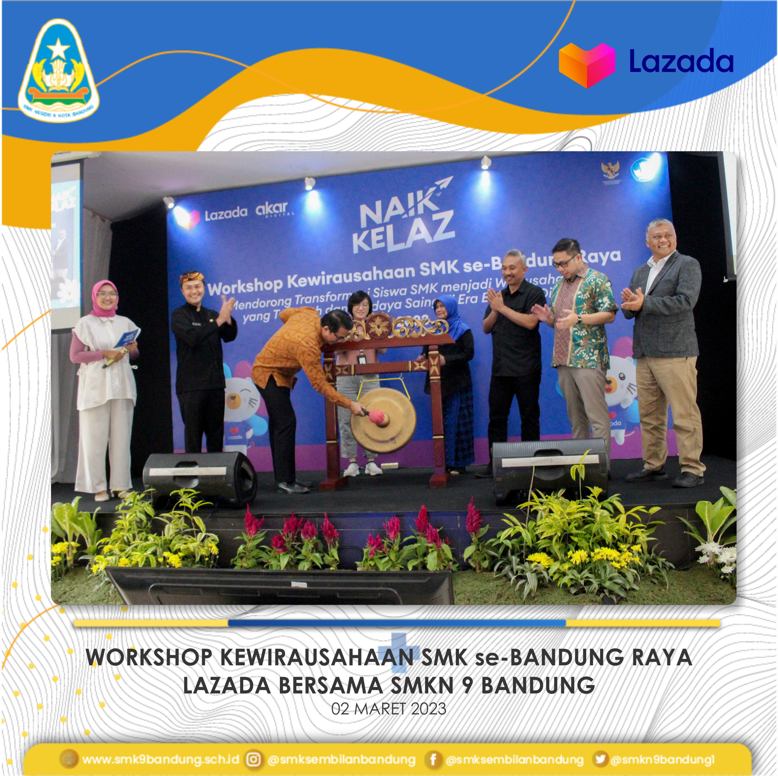 Workshop Kewirausahaan yang diikuti oleh Sekolah Menengah Kejuruan (SMK) se-wilayah Bandung Raya, dilaksanakan pada hari Kamis, 2 Maret 2023 di aula SMKN 9 Bandung. Melalui workshop dengan sponsor utama Lazada ini diharapkan dapat mendorong transformasi siswa SMK untuk menjadi wirausaha baru yang tangguh dan berdaya saing di era ekonomi digital.
